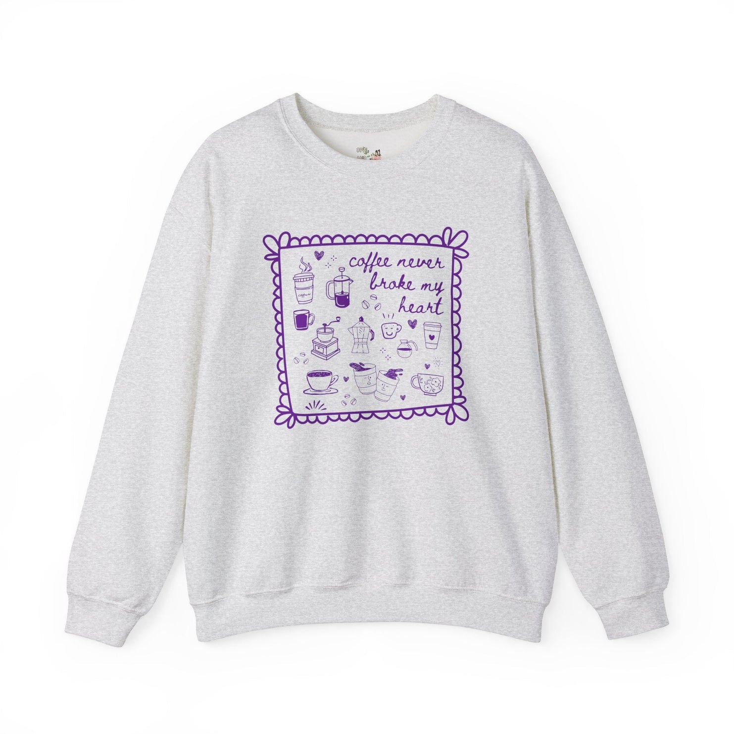 Silly Coffee Lover Crewneck Sweatshirt with Adorable Y2K Aesthetic Doodles: Coffee Never Broke My Heart