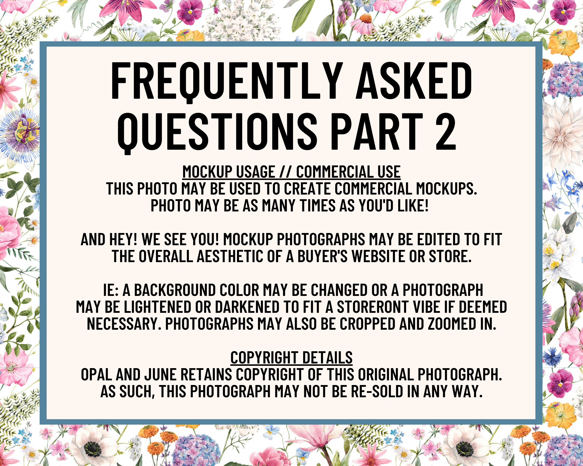 But hey! We see you and totally understand that different brands have different needs. Due to this, mockup photographs may be edited to fit the overall aesthetic of a buyer's website or storefront: ie a background color may be changed or a photograph may be darkened / lightened to fit a storefront vibe if deemed necessary. Photographs may also be cropped, zoomed in, and edited after download.