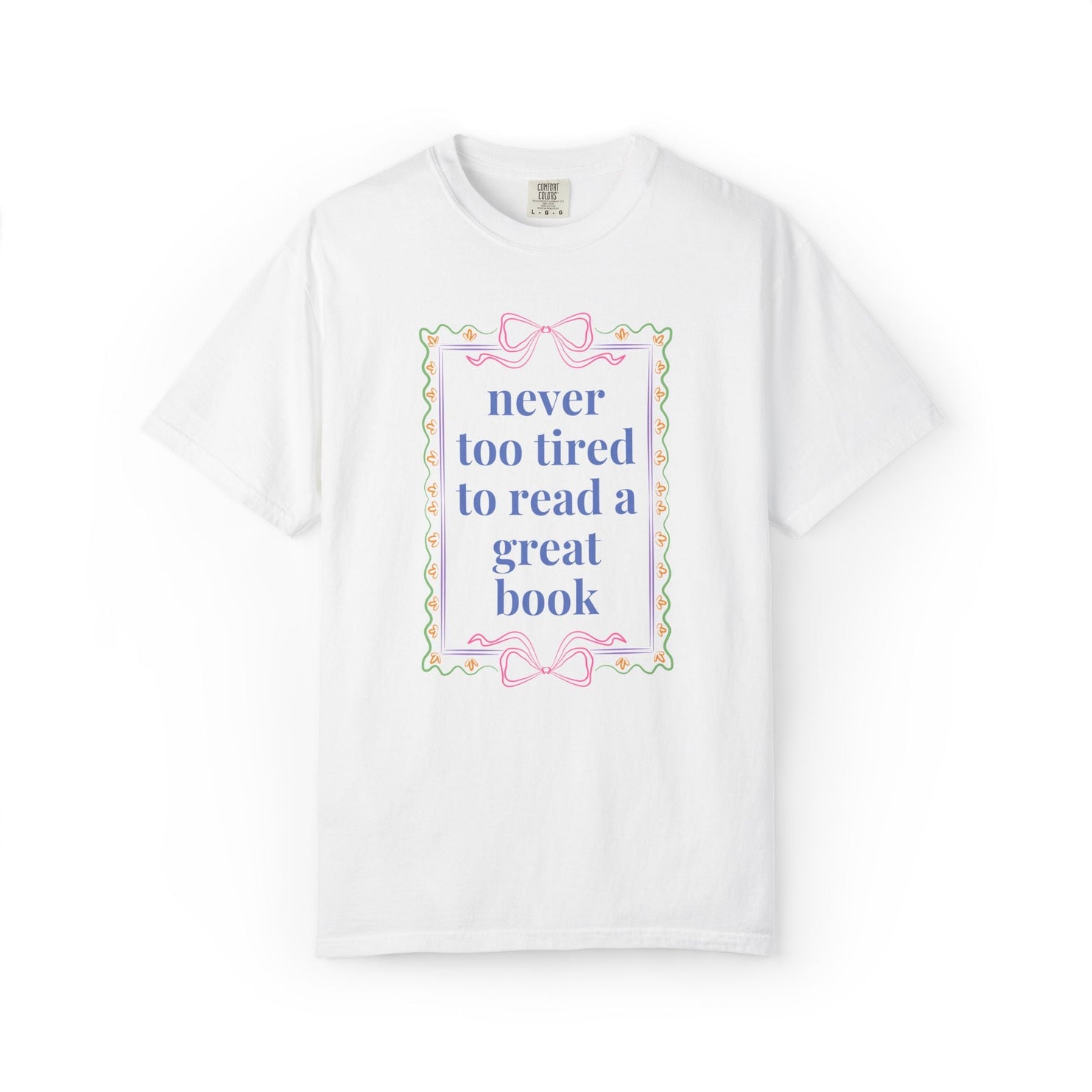Never Too Tired to Read a Good Book T-Shirt: Cute Bookish or Book Lover T-Shirt with Bows