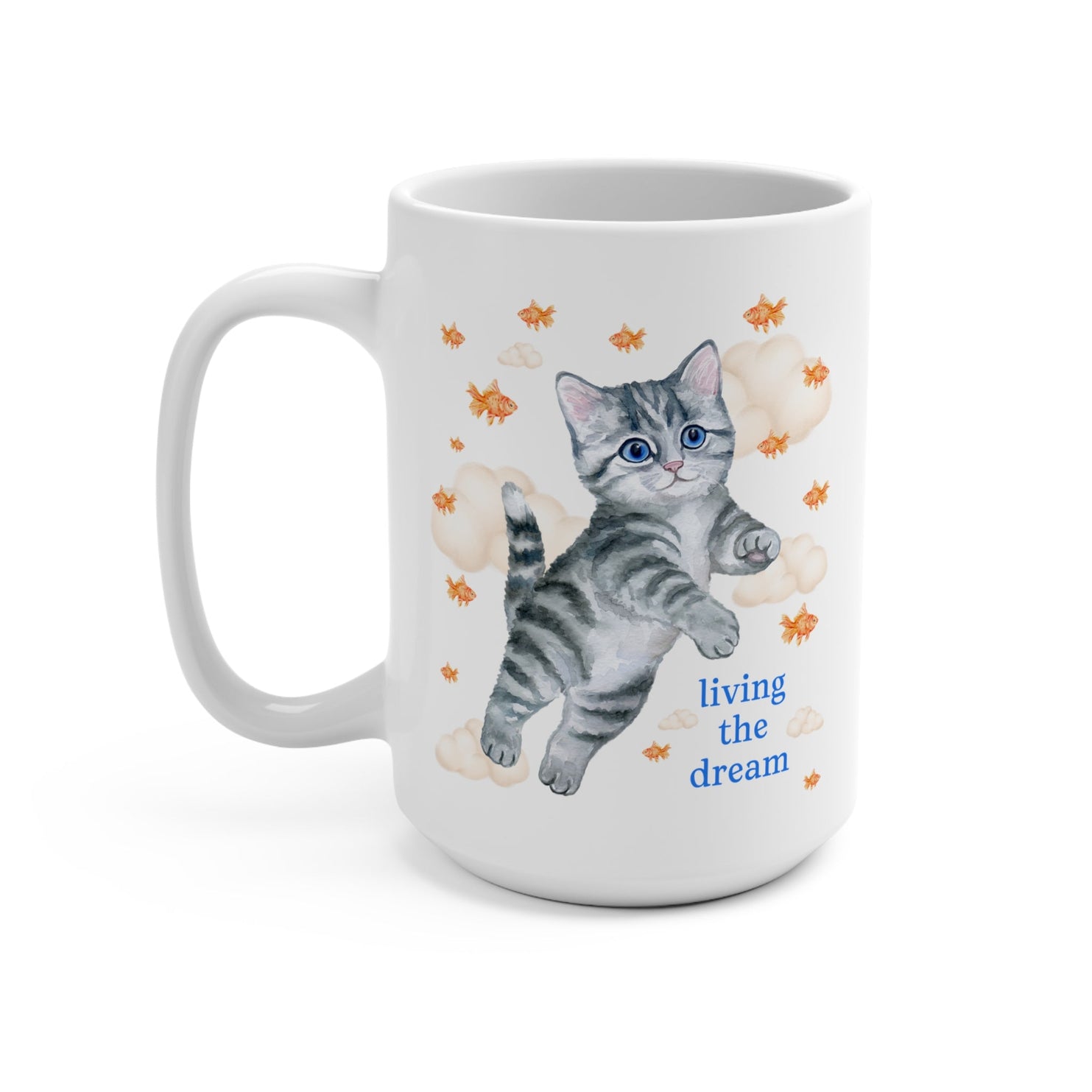 Funny Cat Lover 15 Oz Mug with Cute Watercolor Goldfish: Living the Dream